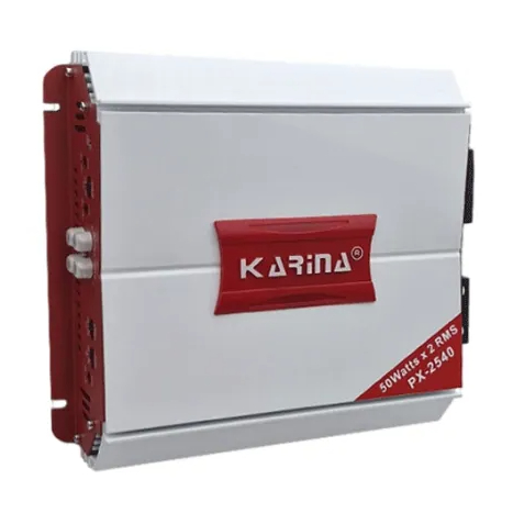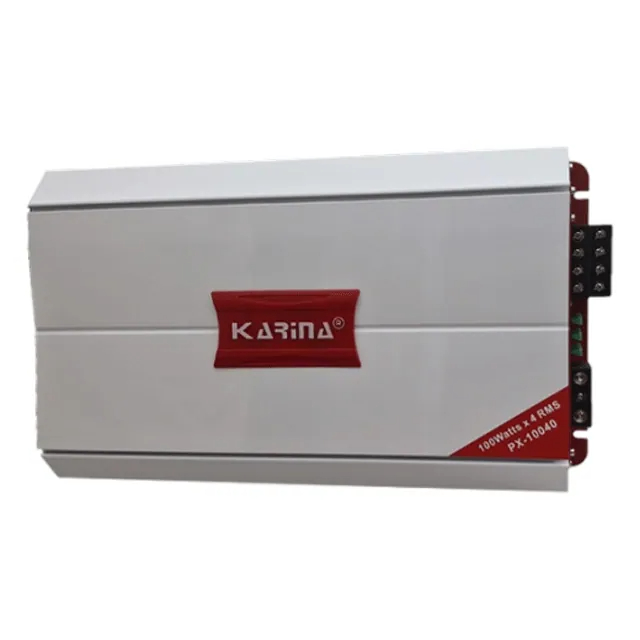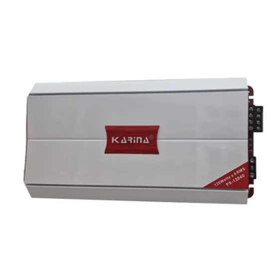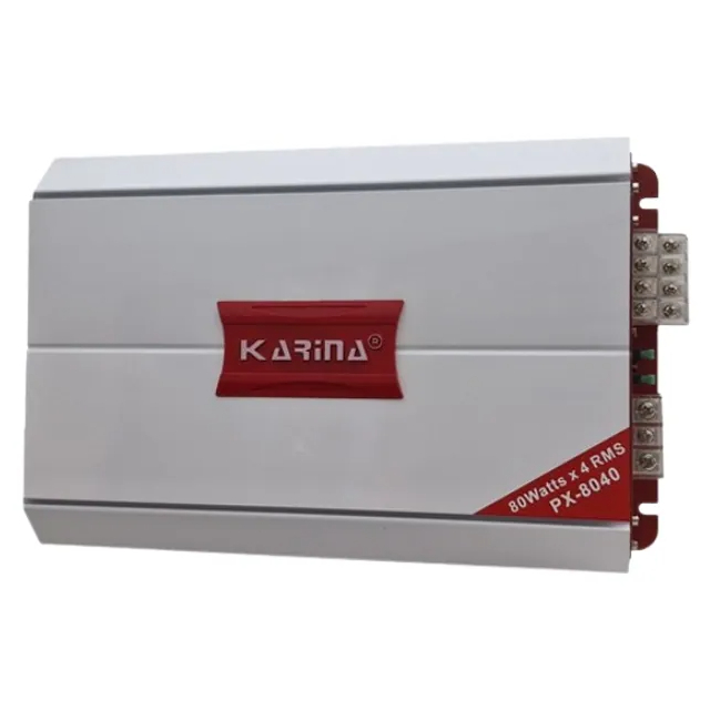 مشخصات آمپلی فایر کارینا PX-8040 آمپلیفایر 4 کاناله کلاس کاری: AB ابعاد: 320 × 220 × 55 میلیمتر RMS در 4 اهم: 4×80 وات RMS در 2 اهم: 4×130 وات بریج در 4 اهم: 2×260 وات توان حداکثر لحظهای (Peak): 3500 وات حساسیت: 90 دسیبل پاسخ فرکانسی: 10Hz – 45KHz اعوجاج هارمونیک کل (THD): < 0٫15٪ قابلیت پلزنی (Bridgeable)